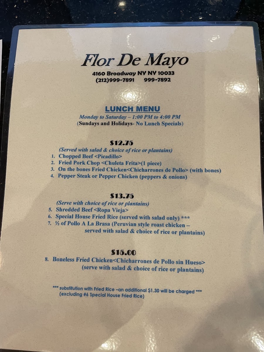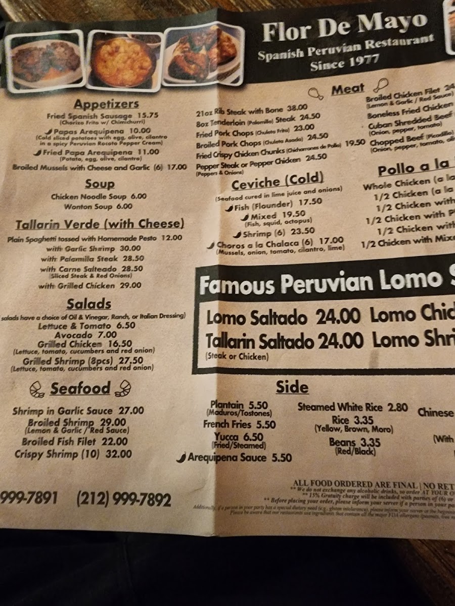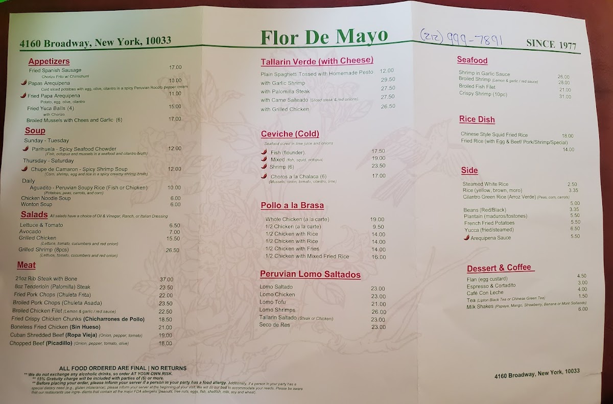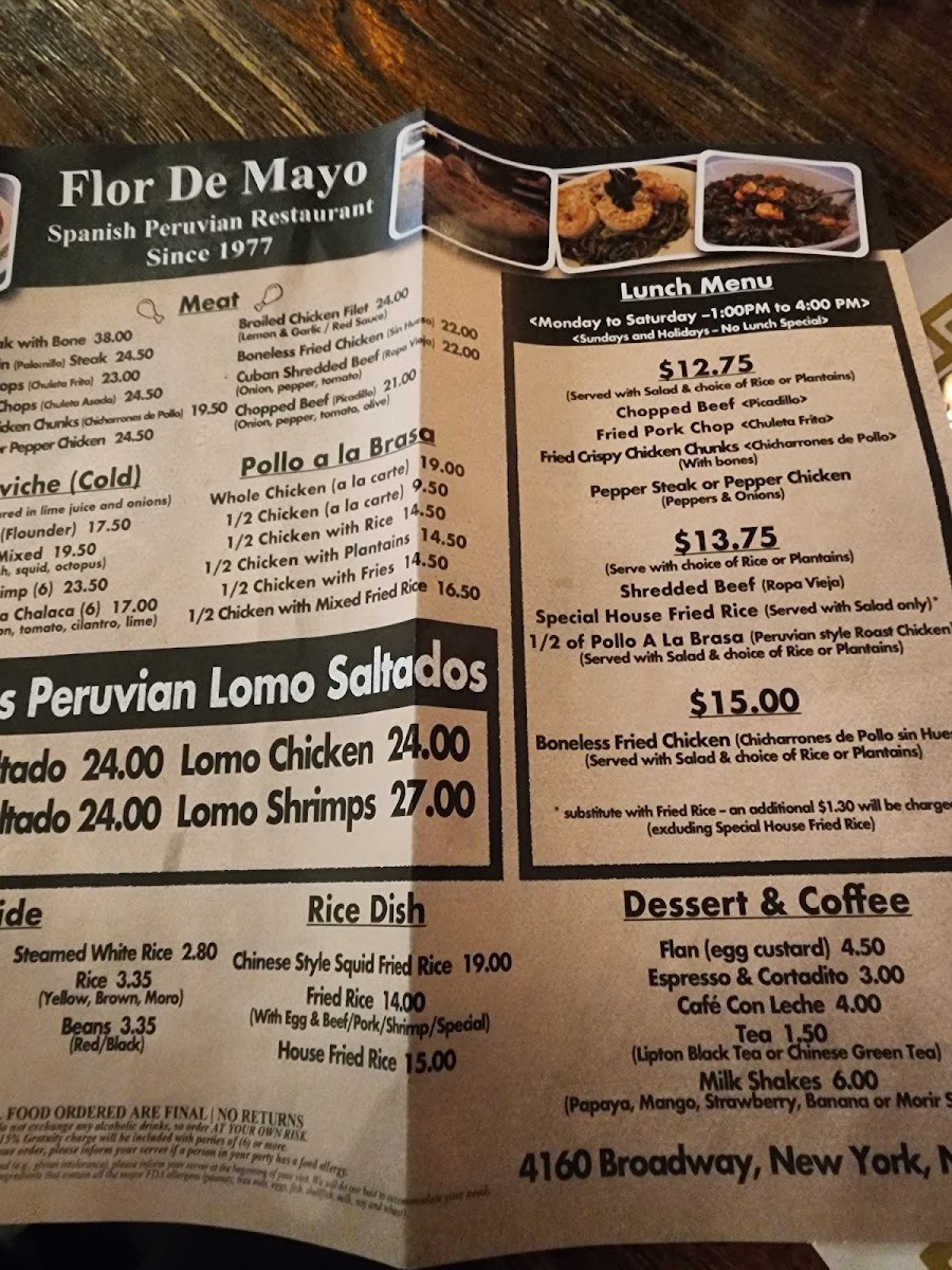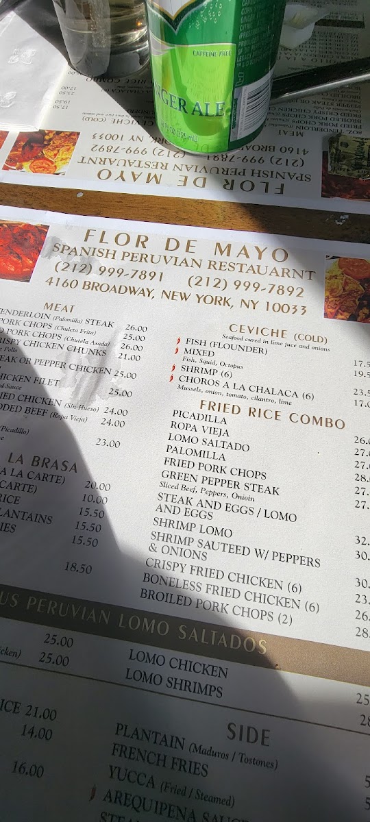 From a reviewer’s perspective, the menu at Flor De Mayo showcases an expansive and eclectic selection that reflects its Chinese‑Peruvian fusion identity. Diners will find classic staples like French Fried Potato, Arequipena Sauce, Fried Sweet Plantain (Maduro), Steamed Yuca, and White Rice among the side orders. The fried rice offerings range from Vegetable Fried Rice to protein‑rich choices like Chicken, Roast Pork, Ham, Mixed, Beef, or Baby Shrimp, plus a hearty House Special Fried Rice with egg, jumbo shrimp, pork, ham, chicken, and vegetables. Appetizers include Egg Roll, Chicken Noodle Soup, and Fried Spanish Sausage, while the pasta selections such as Tallarin Verde With Cheese come paired with proteins like Grilled Chicken Filet or 7 Garlic Shrimps. Peruvian entrées like Lomo Chicken and Lomo Saltado sit alongside seafood favorites such as Camarones Enchilado, Broiled Shrimp, and Shrimp With Broccoli. The “Fried Rice Combo” section (e.g., Fried Pork Chops (2 Pieces) and Shrimp Lomo (7 Shrimps)) adds variety, and the Pollo a La Brasa options range from a 1/2 Chicken With Rice Or Plantains Or Fries to a Whole Chicken. Salad choices include Grilled Shrimp (8) and Lettuce And Tomato With Avocado, while ceviche selections such as Fish (Flounder) and Shrimp (6) Mixed round out the lighter fare. Accompanying the food are sodas and beverages like Sprite, Pellegrino 750 Ml Bottle, Pineapple Juice, Pepsi, Strawberry Milk Shake, Virgin Pina Colada, Inca Kola, and Diet Coke. The menu’s variety and approachable prices reflect a place that is both unpretentious and generous in portions, with plenty of choices to please fans of both Latin American and Chinese‑inspired dishes.